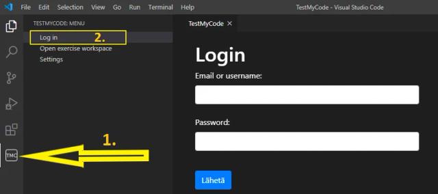 Start TestMyCode Extension by clicking TMC icon in the left bar, log in by clicking Log in button. Use the account you made in previous step to log in.